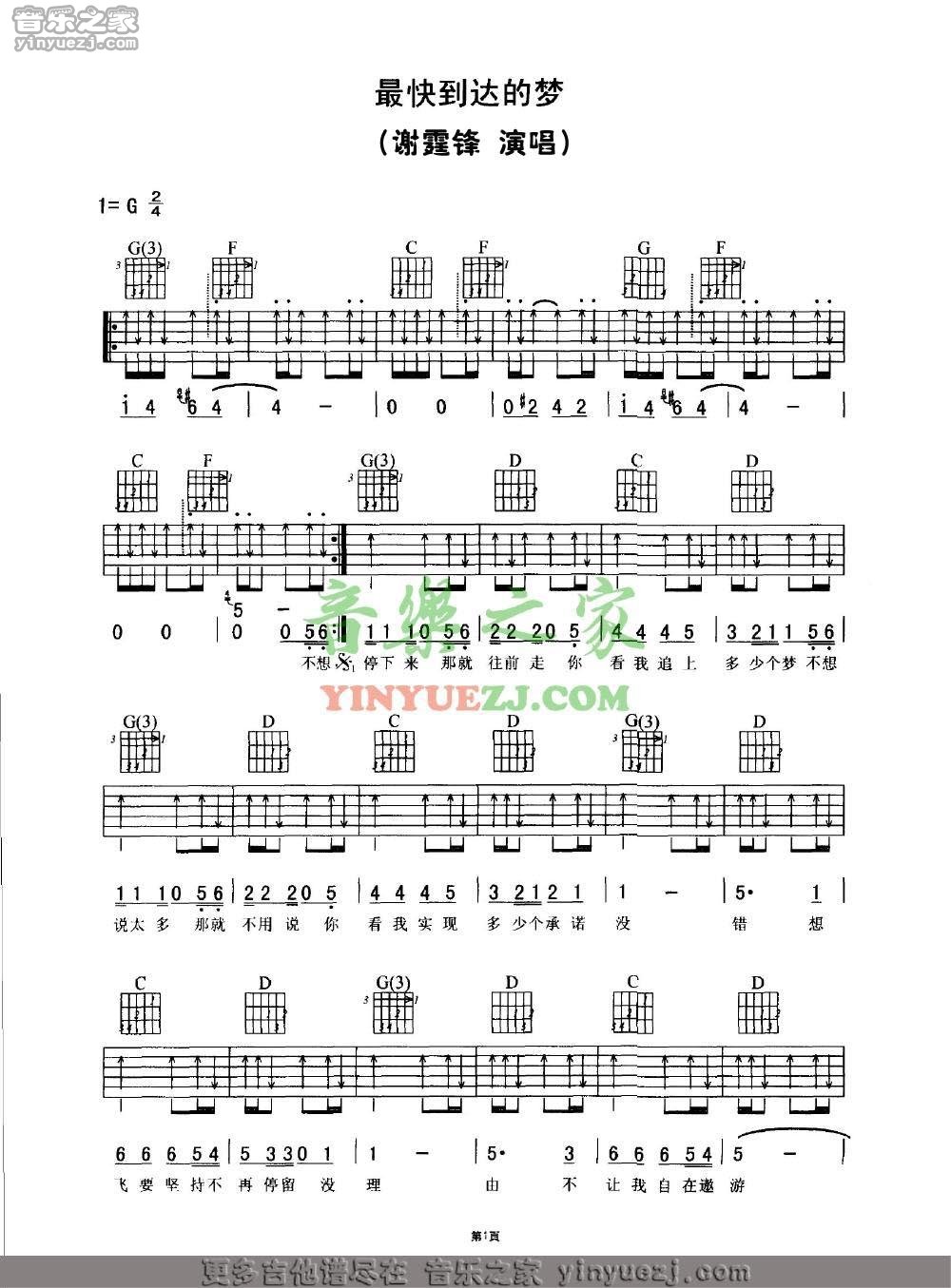 谢霆锋《最快到达的梦》吉他谱,YYZJ编配出品,共有3张高清图谱。...