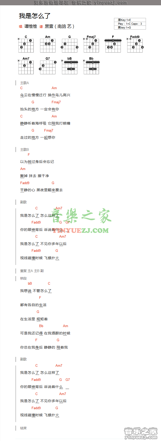 谭维维《我是怎么了》吉他谱,YYZJ编配出品,共有1张高清图谱,免翻页排版设计。...