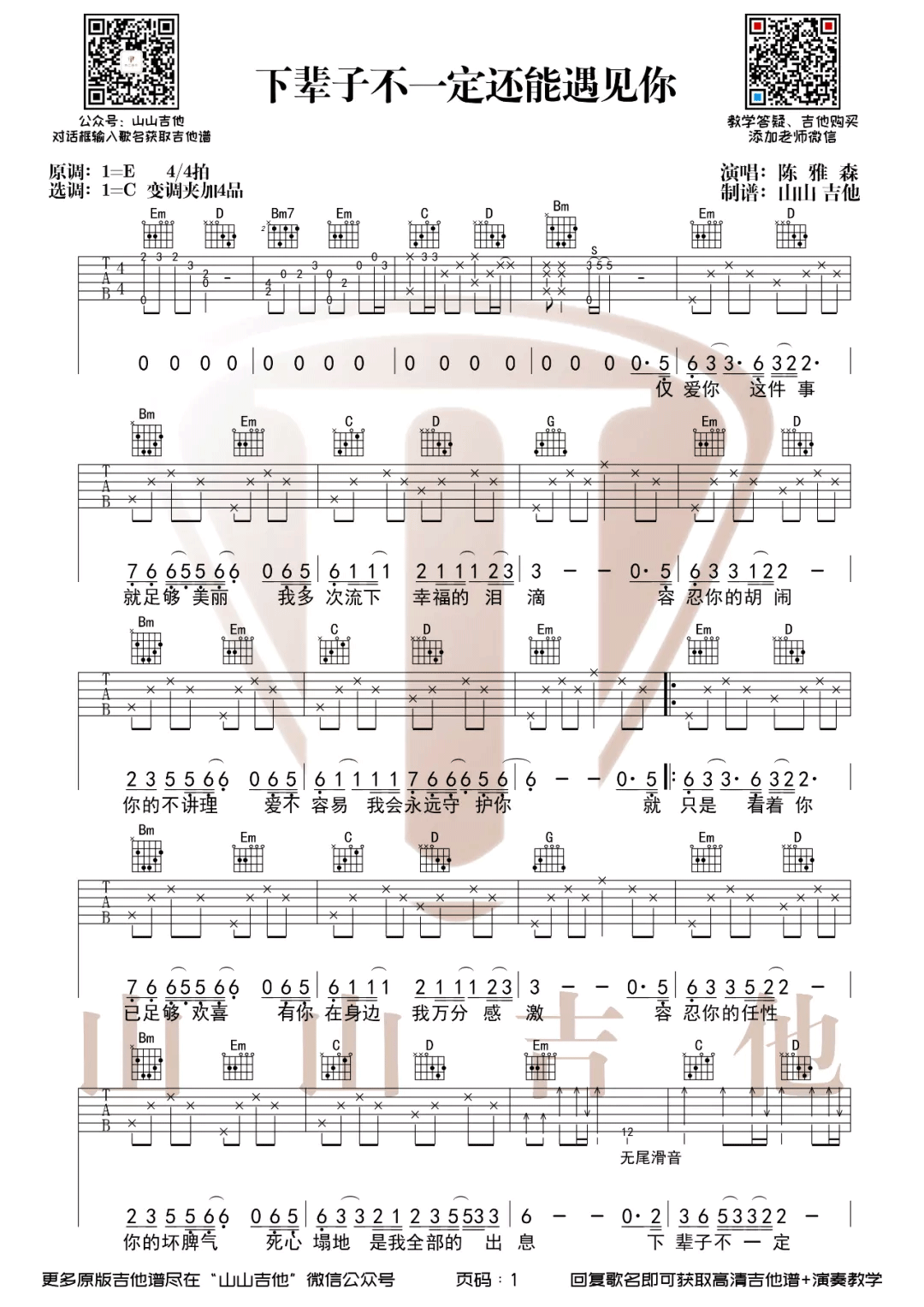 吉他陈雅森《下辈子不一定还能遇见你》吉他谱 - 山山吉他编配