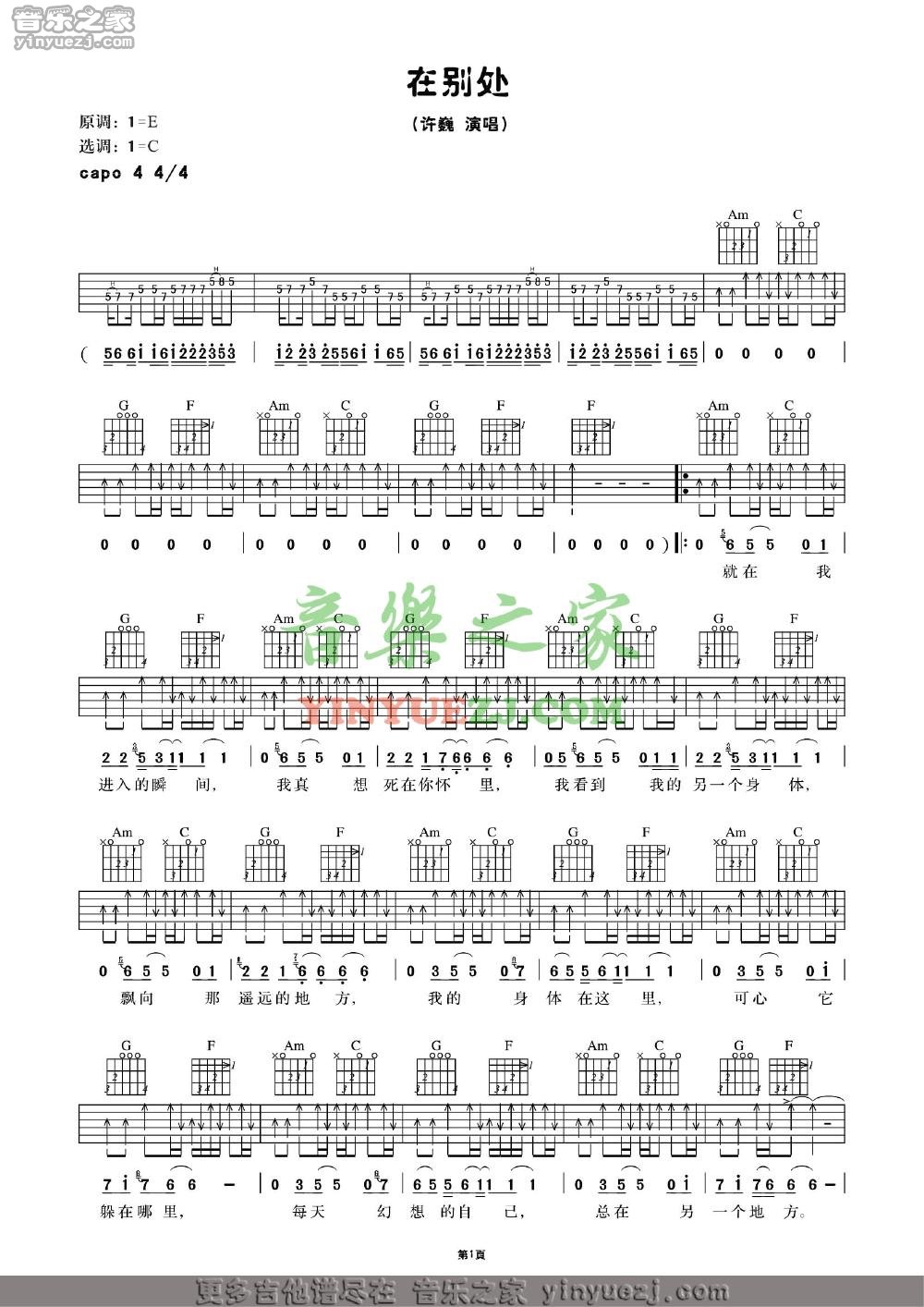 许巍《在别处》吉他谱,YYZJ编配出品,共有3张高清图谱。...