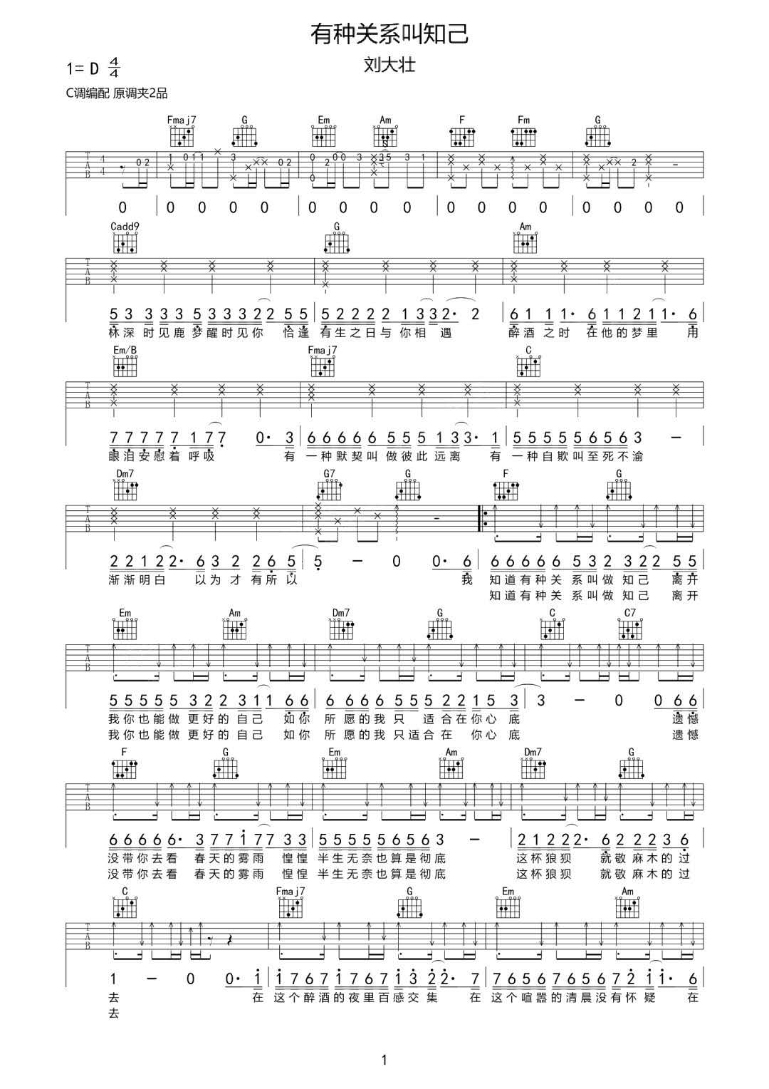 用C调原版弹唱谱编配,原调变调夹2品,具体根据个人嗓音调节。《有种关系叫知己》是由刘大壮演唱的一首歌,林深时见鹿,梦醒时见你,恰逢有生之日与你相遇,酒醉之时,在他的梦里,用眼泪安慰着呼吸。有一种默契叫做彼此远离,有一种自欺叫至死不渝,渐渐明白,因为才有所以,我知道有种关系叫做知己...