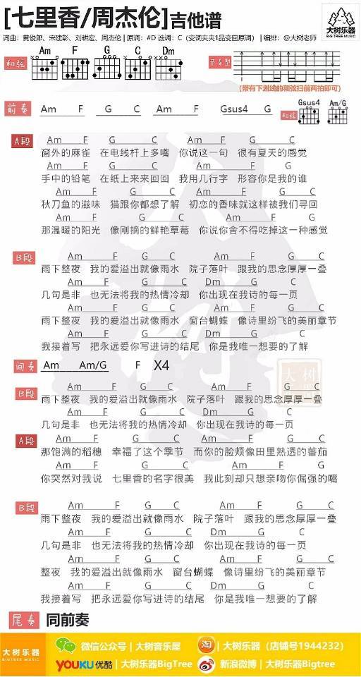 周杰伦《七里香》吉他谱,大树音乐屋编配出品,共有1张高清图谱,免翻页排版设计。...