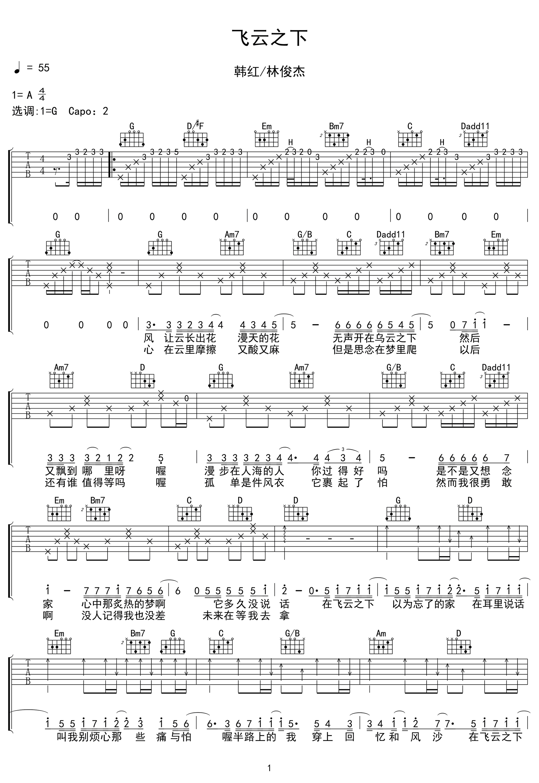 林俊杰《飞云之下》吉他谱,共有2张高清图谱,免翻页排版设计。...