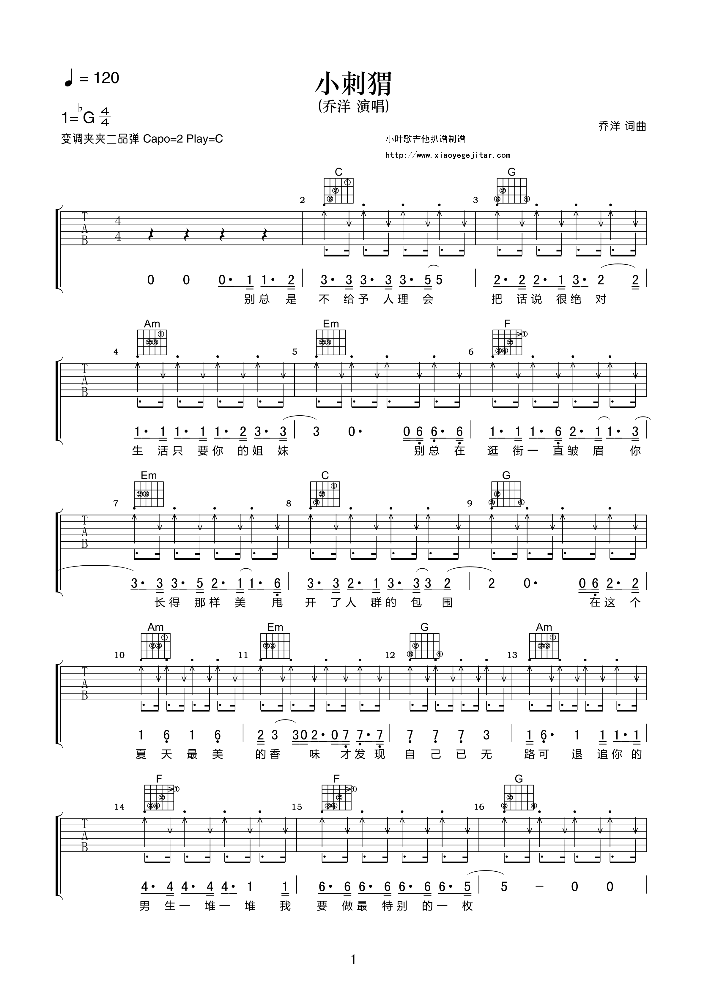 乔洋《小刺猬》吉他谱,小叶歌编配出品,共有5张高清图谱。...