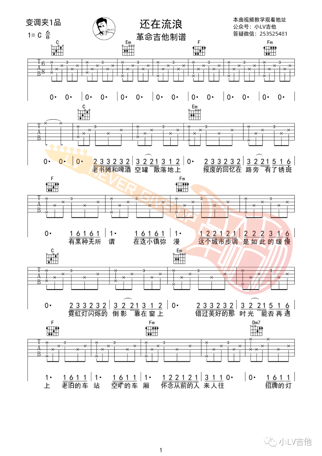 周杰伦《还在流浪》吉他谱,革命吉他编配出品,共有3张高清图谱。...