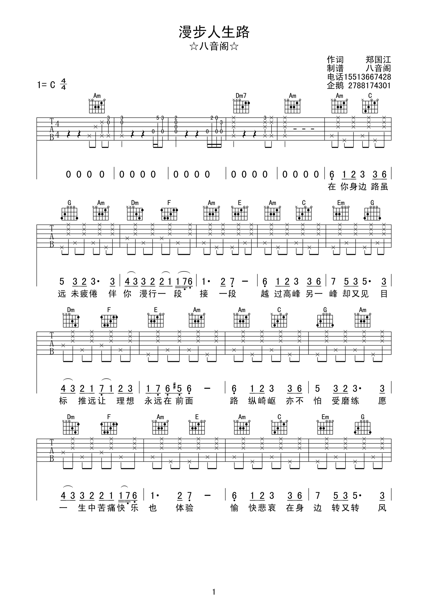 邓丽君《漫步人生路》吉他谱,八音阁编配出品,共有2张高清图谱,免翻页排版设计。...