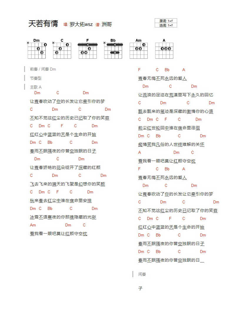 吉他罗大佑《天若有情》吉他谱 - 免费版