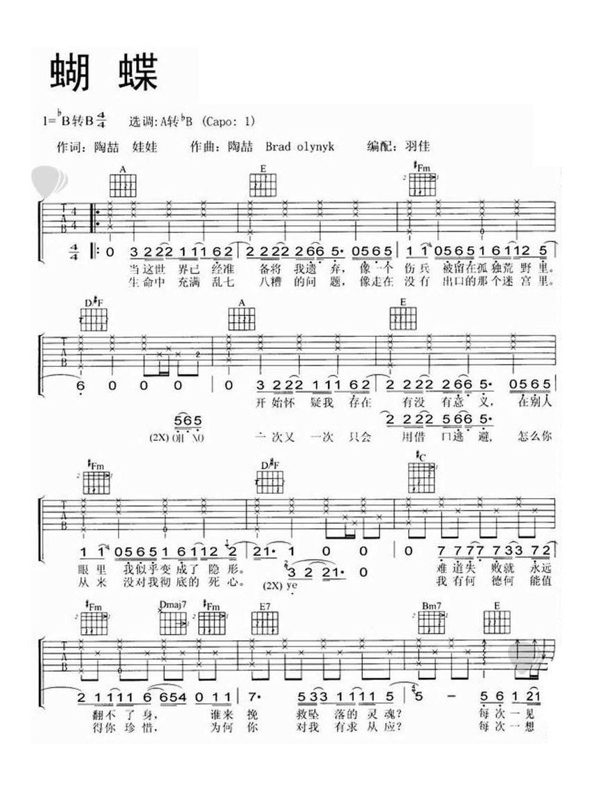 陶喆《蝴蝶》吉他谱,小玲珑吉他编配出品,共有4张高清图谱。...