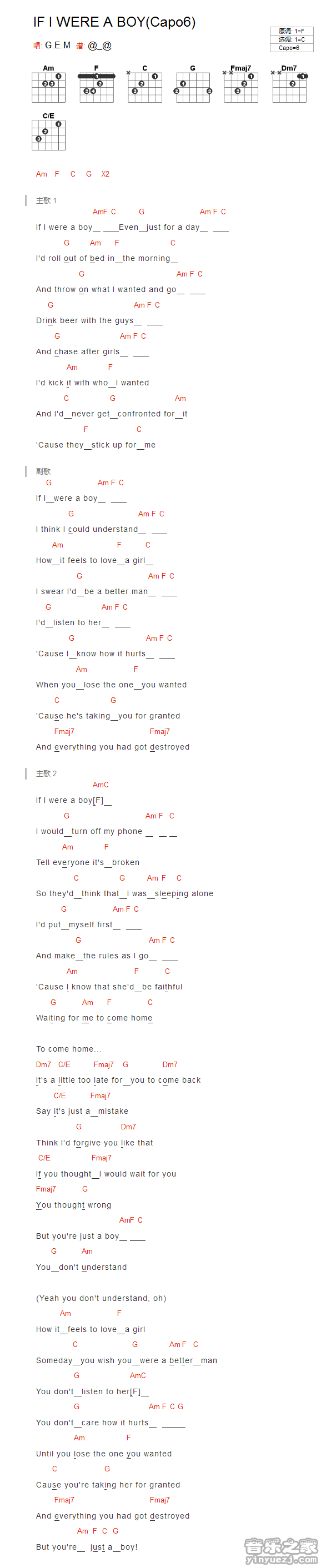 邓紫棋《IFIWEREABOY》吉他谱,YYZJ编配出品,共有1张高清图谱,免翻页排版设计。...