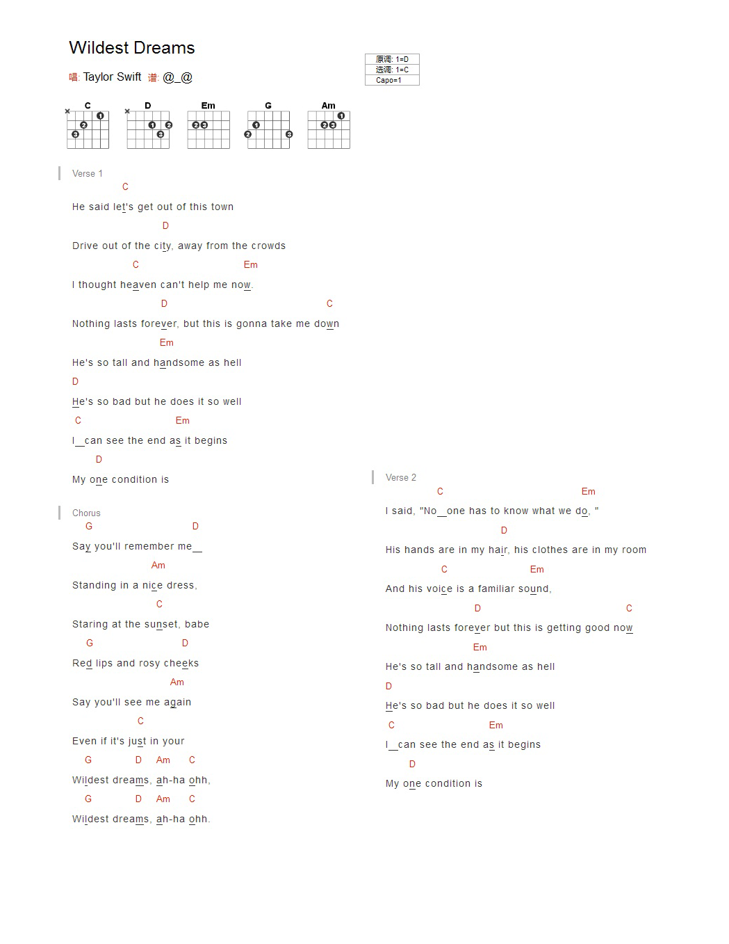 吉他TaylorSwift《Wilddest Dreams》吉他谱