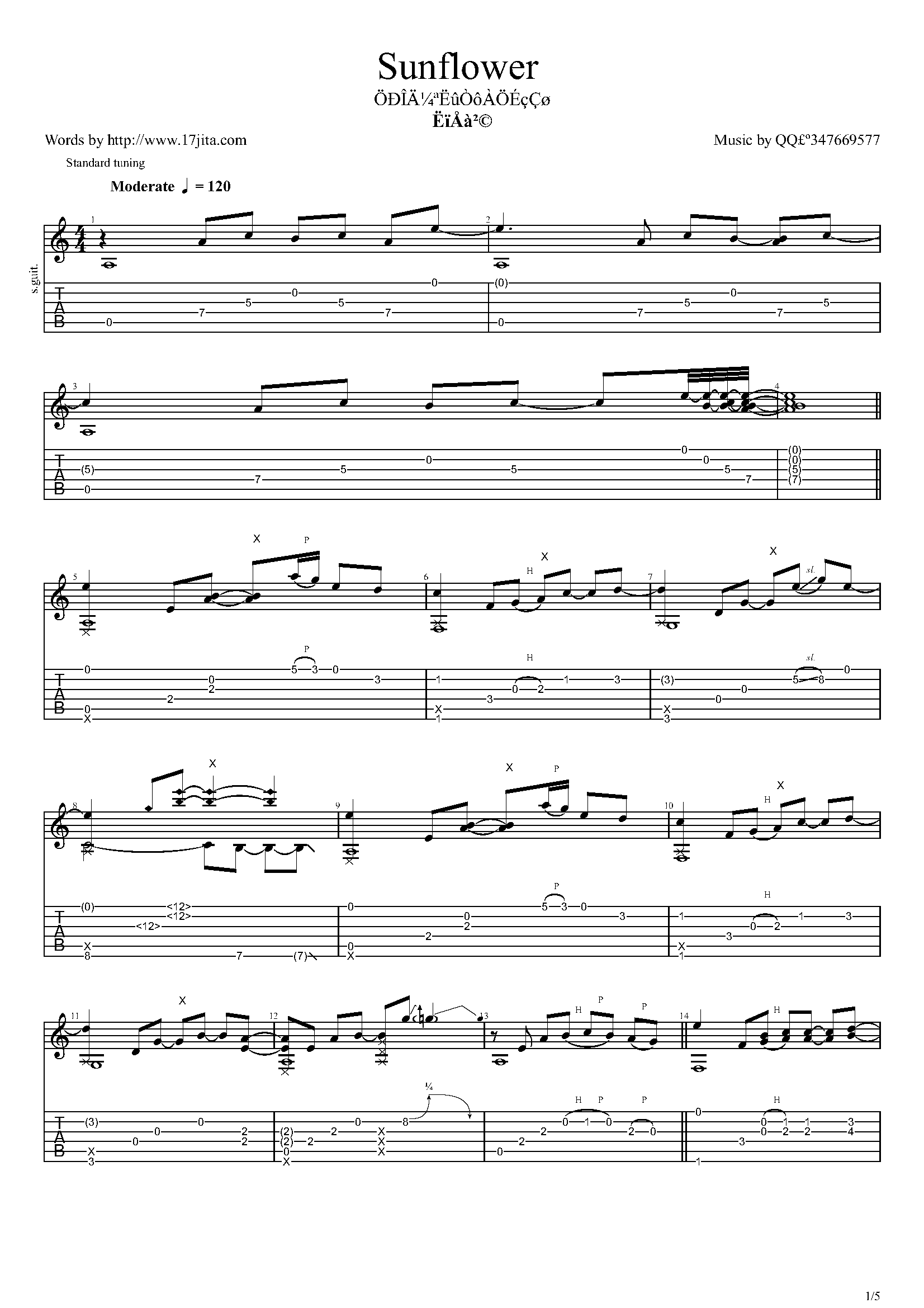 孙培博《sunflower》吉他谱,共有5张高清图谱。...
