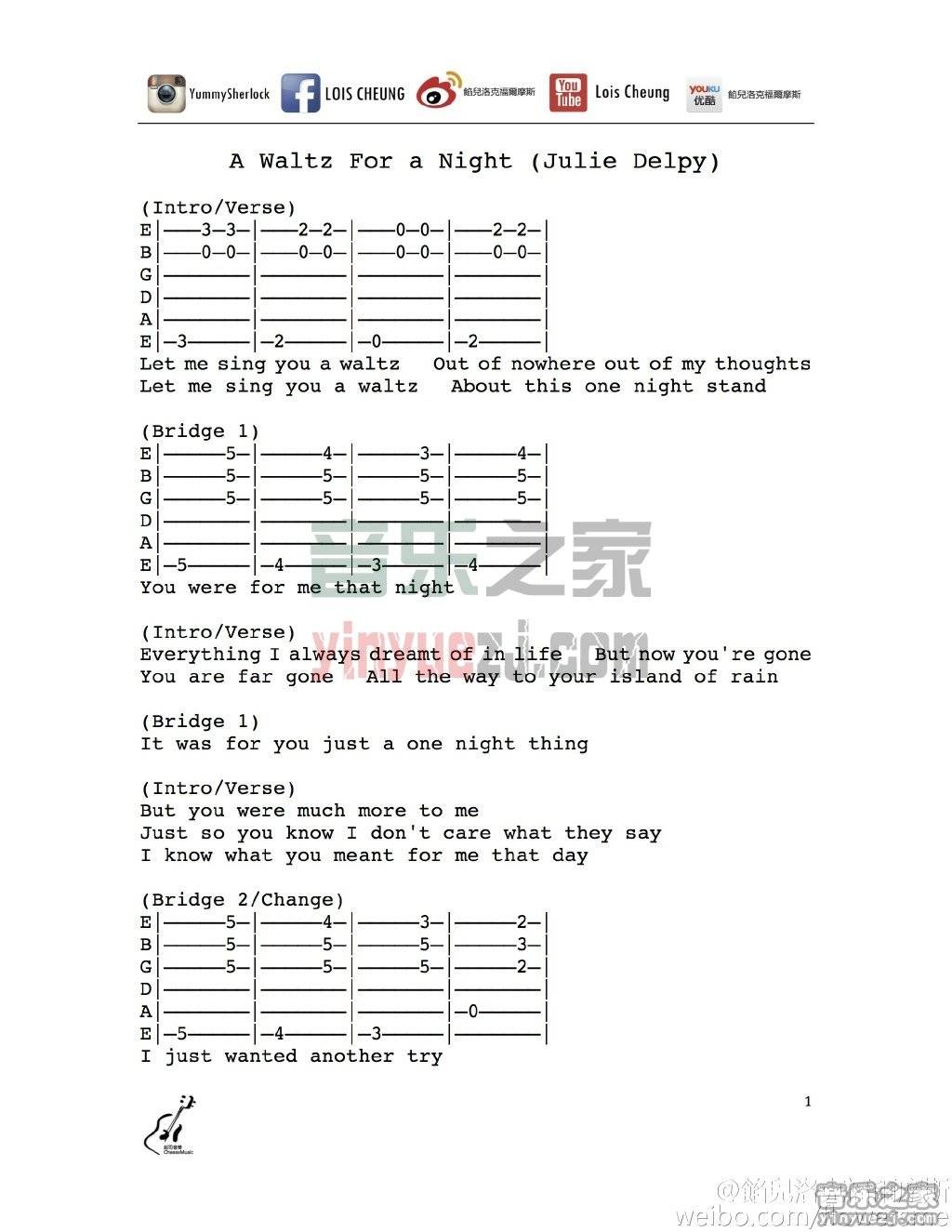 林一峰《awaltzforanight》吉他谱,YYZJ编配出品,共有2张高清图谱,免翻页排版设计。...