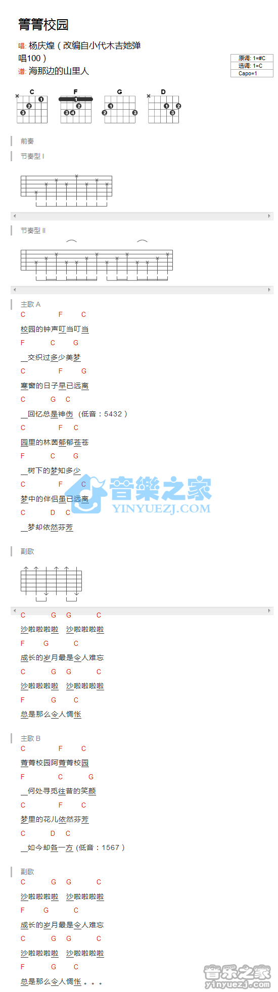 杨庆煌《菁菁校园》吉他谱,YYZJ编配出品,共有1张高清图谱,免翻页排版设计。...
