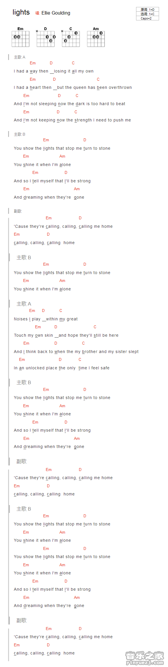EllieGoulding《lights》吉他谱,YYZJ编配出品,共有1张高清图谱,免翻页排版设计。...