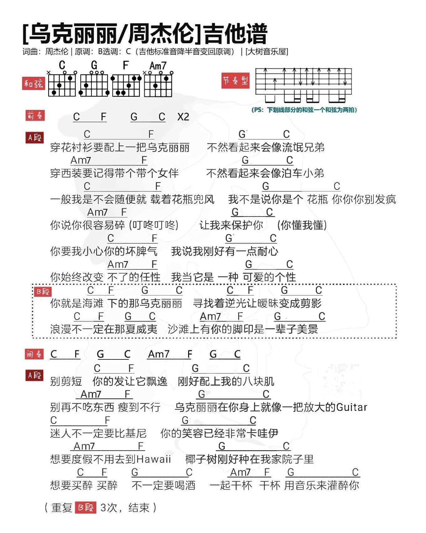 周杰伦《乌克丽丽》吉他谱,大树音乐屋编配出品,共有1张高清图谱,免翻页排版设计。...