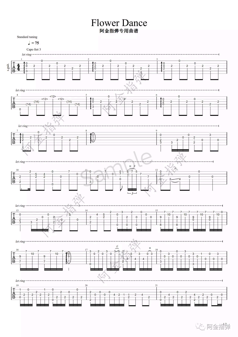 DJ《flowerdance》吉他谱,阿金指弹编配出品,共有3张高清图谱。...