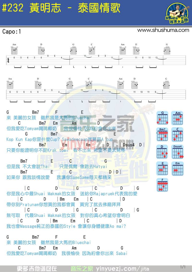黄志明《泰国情哥》吉他谱,马叔叔编配出品,共有1张高清图谱,免翻页排版设计。...