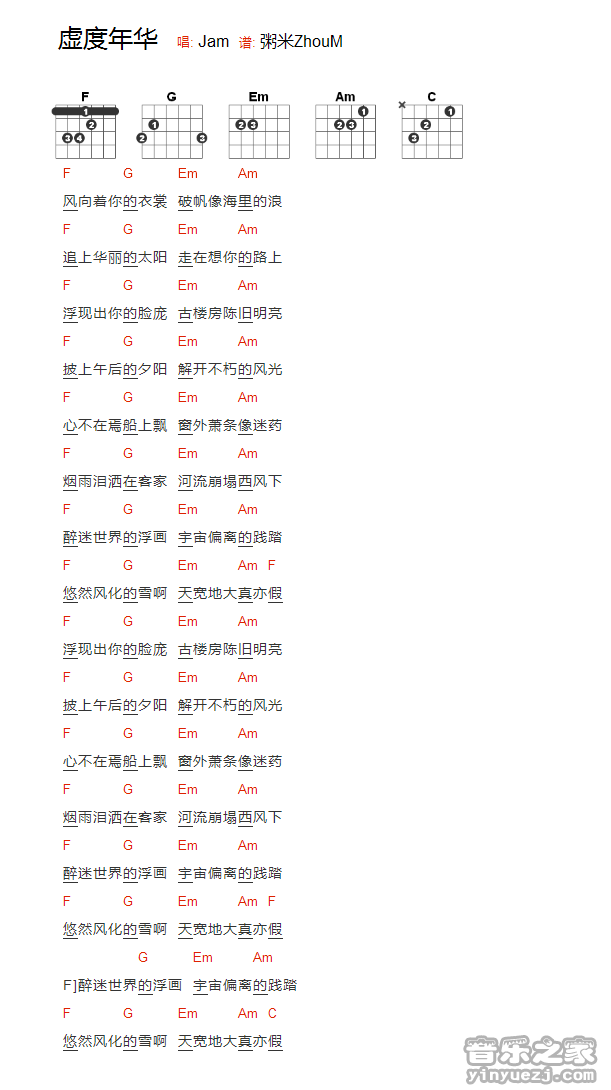 Jam《虚度年华》吉他谱,YYZJ编配出品,共有1张高清图谱,免翻页排版设计。...