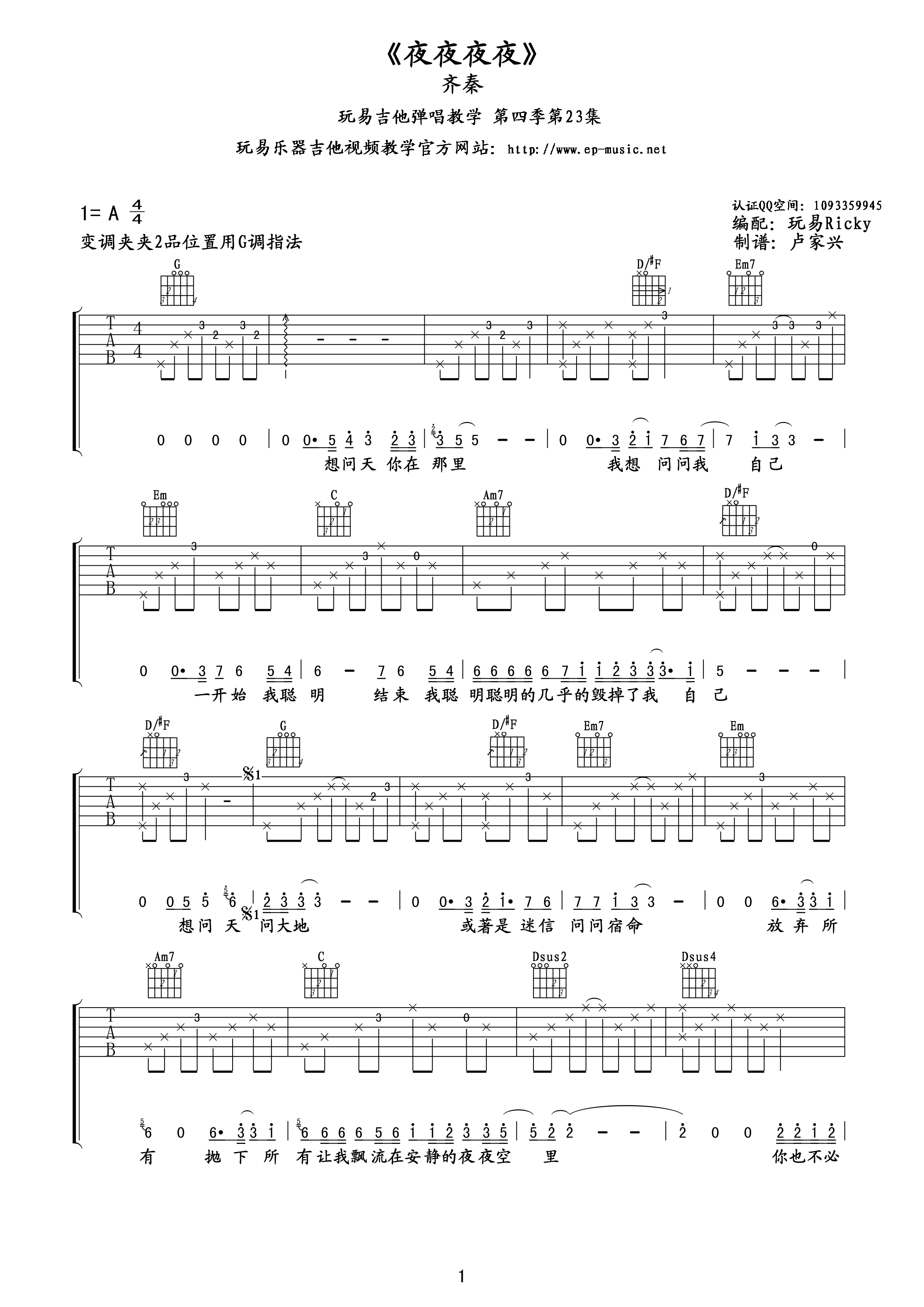 吉他齐秦《夜夜夜夜》吉他谱 - 玩易吉他--卢家兴编配