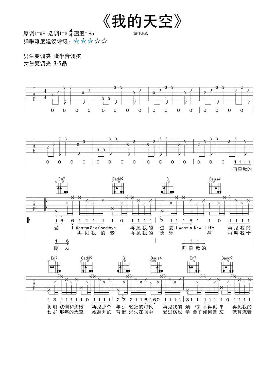南征北战《我的天空》吉他谱,孙学长吉他教室编配出品,共有4张高清图谱。...