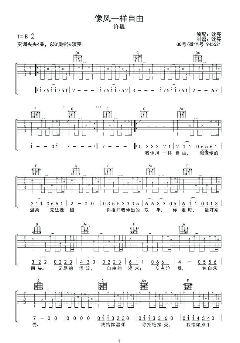 许巍《像风一样自由》吉他谱,完形吉他--沈亮编配出品,共有2张高清图谱,免翻页排版设计。...