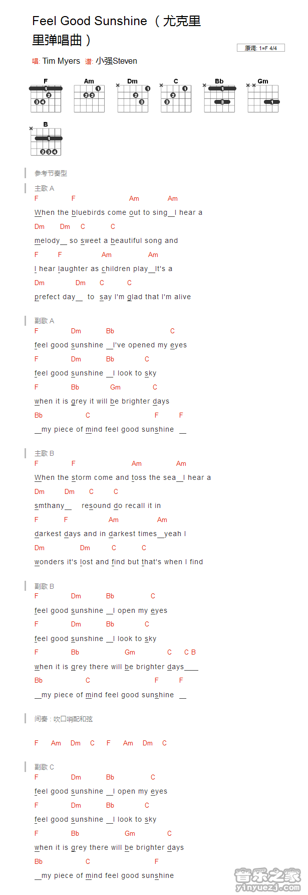 timmyers《FeelGoodSunshine》吉他谱,YYZJ编配出品,共有1张高清图谱,免翻页排版设计。...