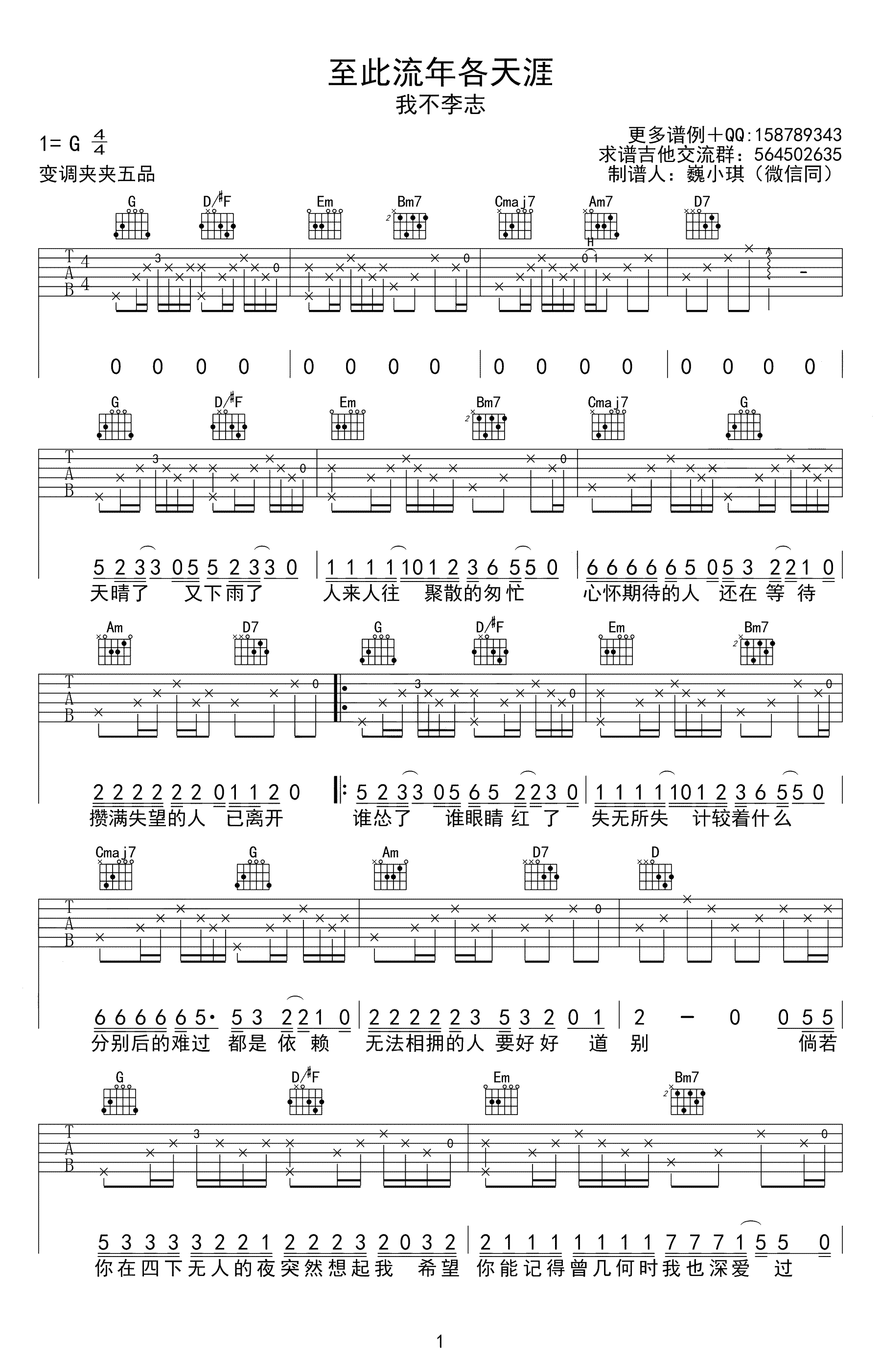 我不李志《至此流年各天涯》吉他谱,G调指法编配,变调夹夹五品。一首好听的民谣歌曲,愿你对过往的一切都情深意重,但无需回头平静生活,倘若你在四下无人的夜突然想起我,希望你能记得曾几何时我也深爱过。...