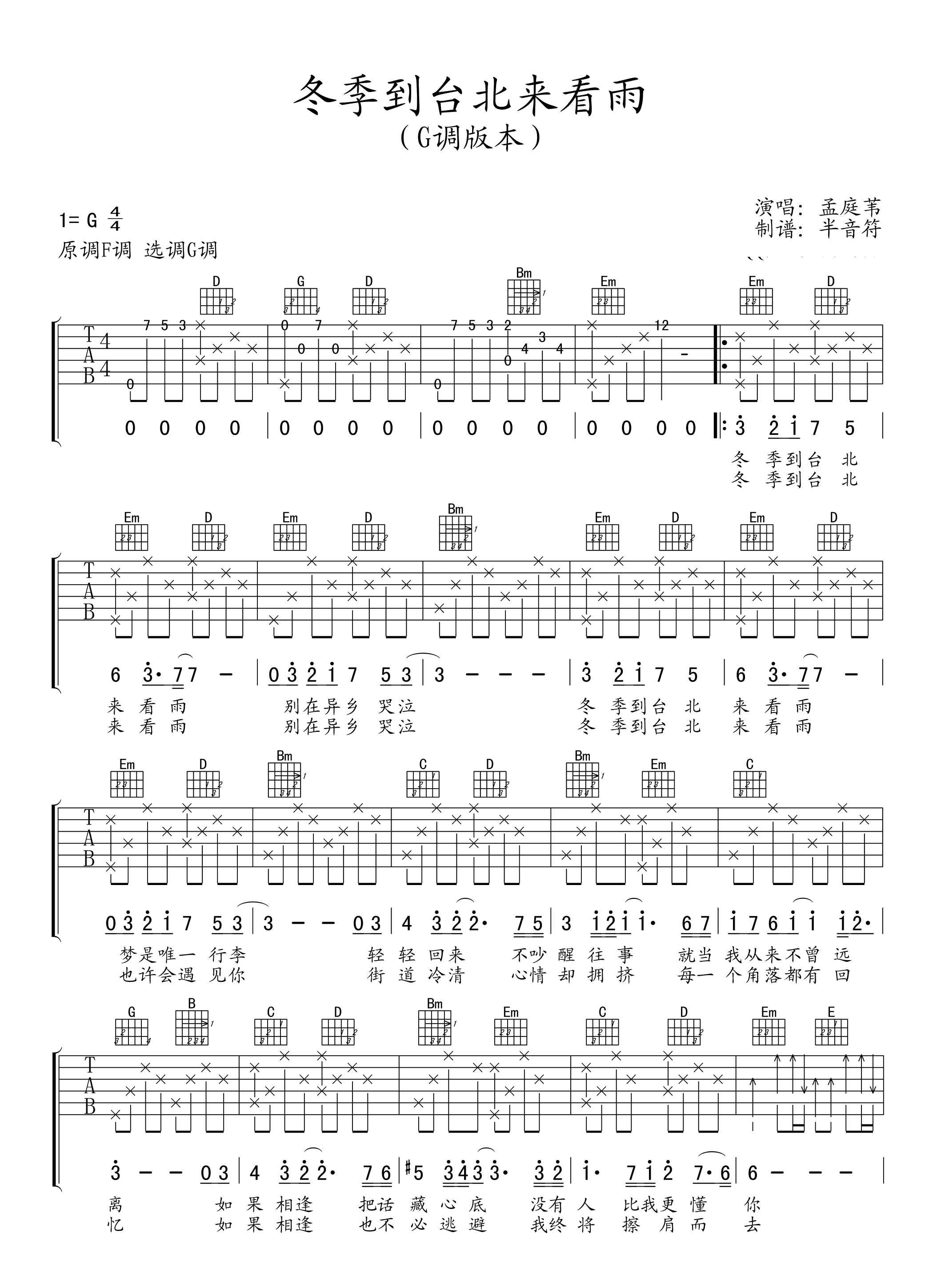 吉他孟庭苇《冬季到台北来看雨》吉他谱 - 小编推荐练习