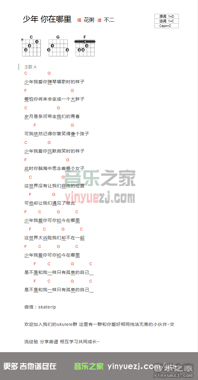 花粥《少年你在哪里》吉他谱,YYZJ编配出品,共有1张高清图谱,免翻页排版设计。...