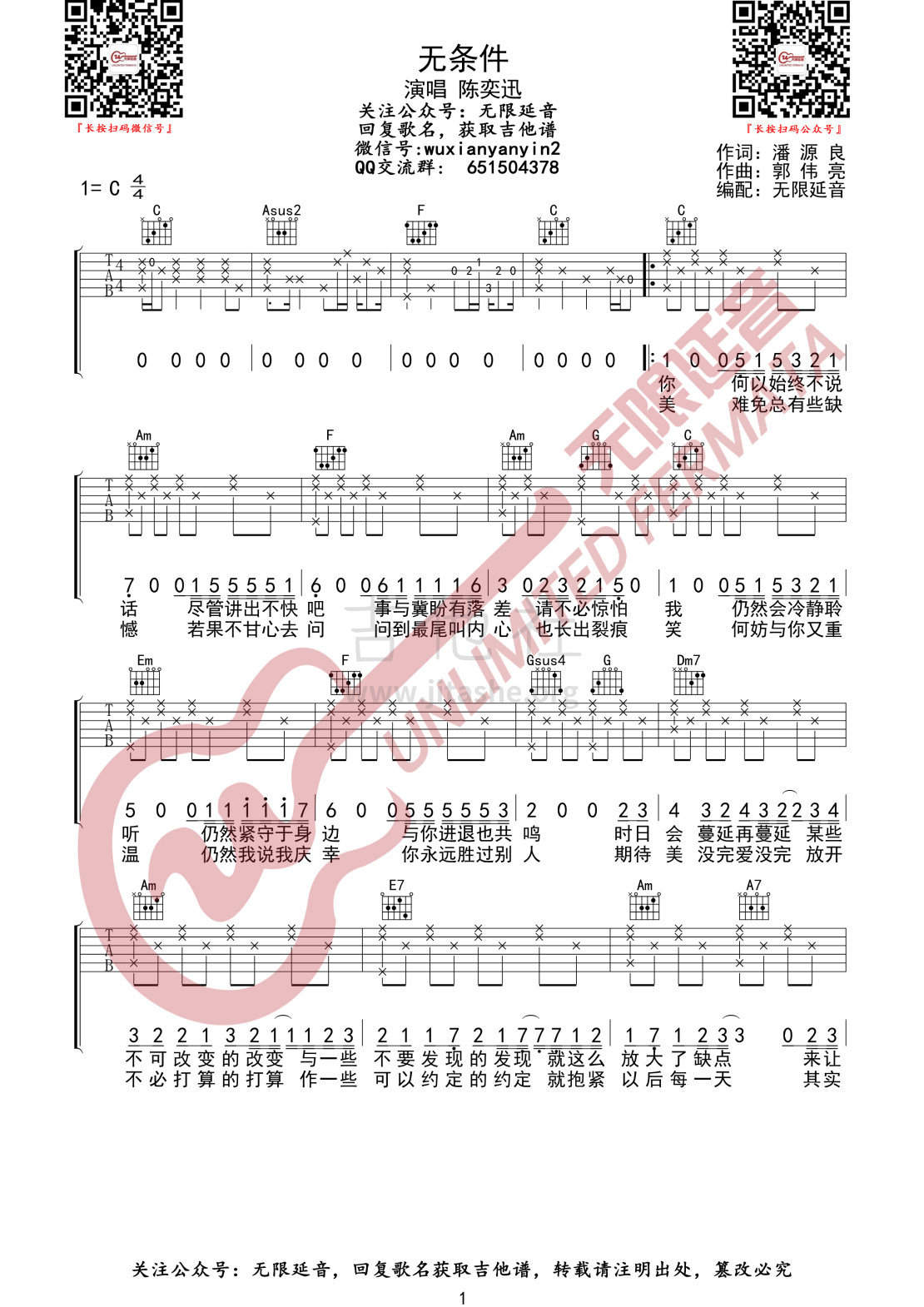 吉他陈奕迅《无条件》吉他谱 - 好听到爆炸