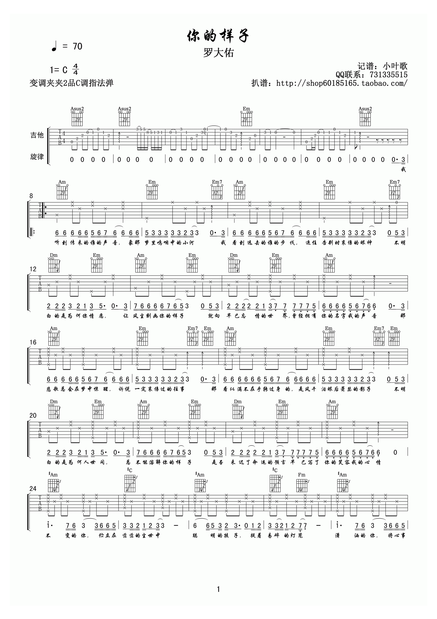 吉他罗大佑《你的样子》吉他谱 - 小编推荐练习