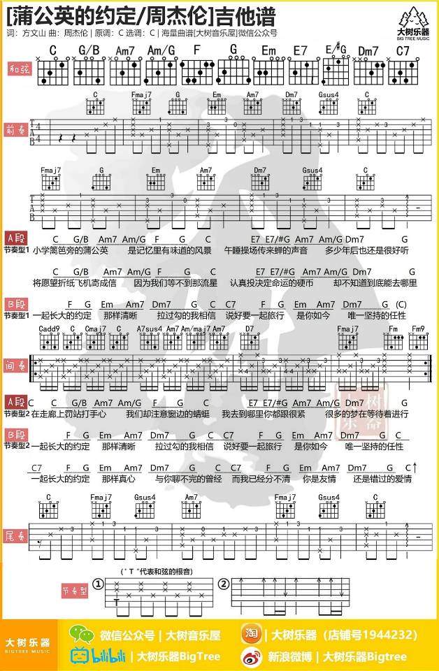 周杰伦《蒲公英的约定》吉他谱,大树音乐屋编配出品,共有1张高清图谱,免翻页排版设计。...