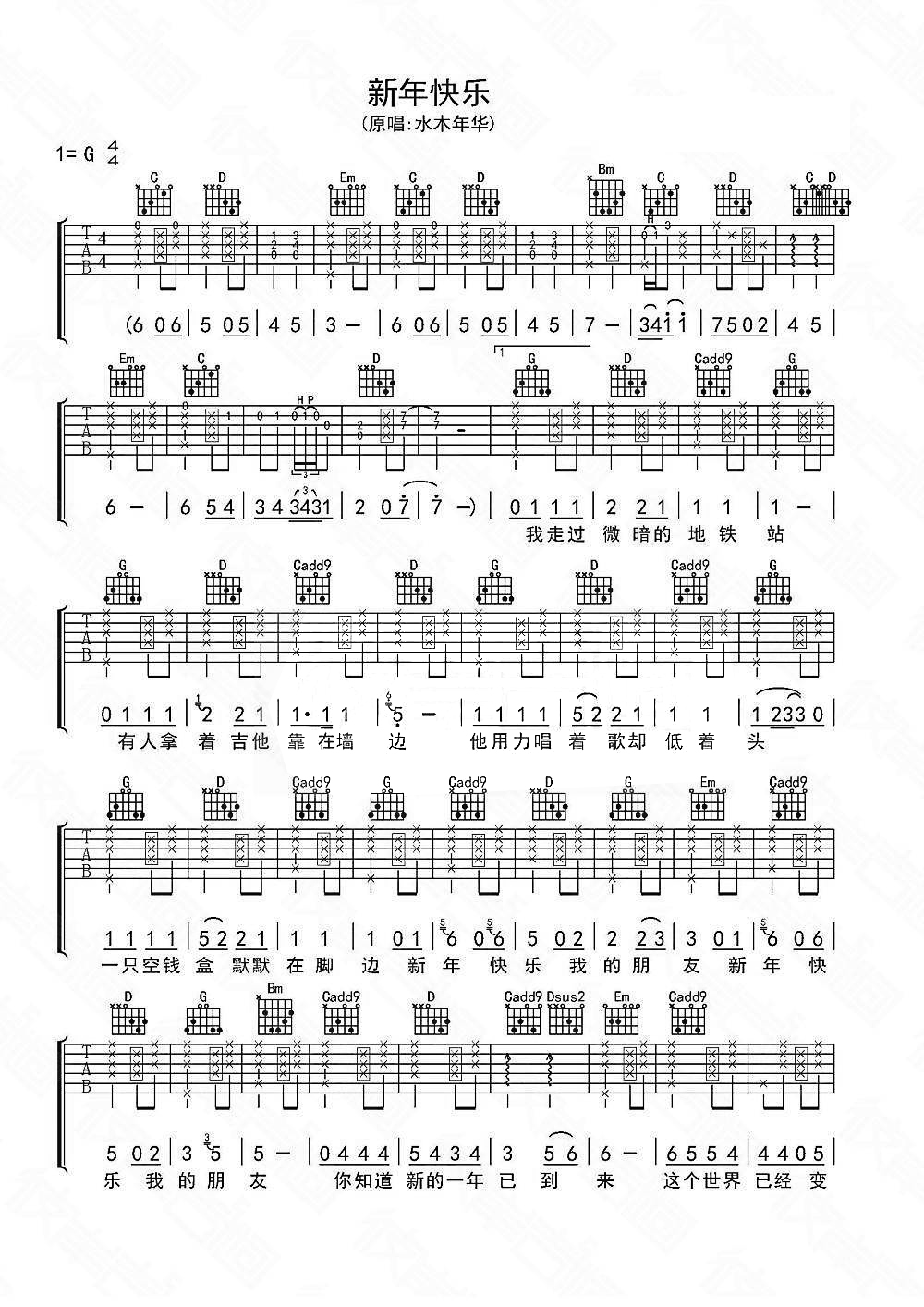 水木年华《新年快乐》吉他谱,共有2张高清图谱,免翻页排版设计。...