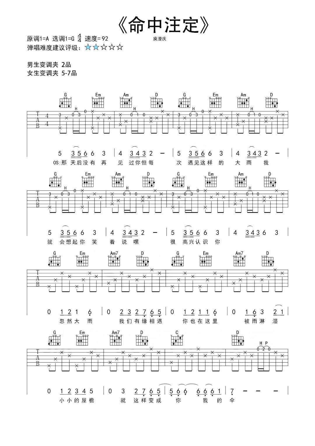 吉他庾澄庆《命中注定》吉他谱 - 非常多人都在弹的版本