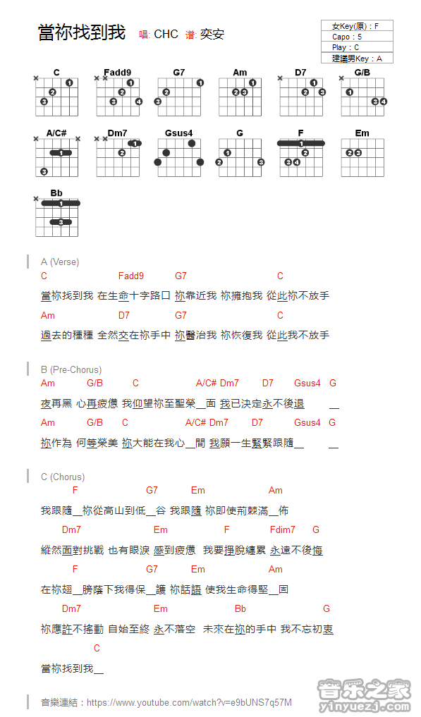 CHC《当你找到我》吉他谱,YYZJ编配出品,共有1张高清图谱,免翻页排版设计。...