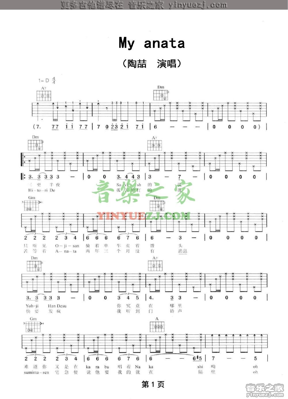 陶喆《MyAnata》吉他谱,YYZJ编配出品,共有2张高清图谱,免翻页排版设计。...