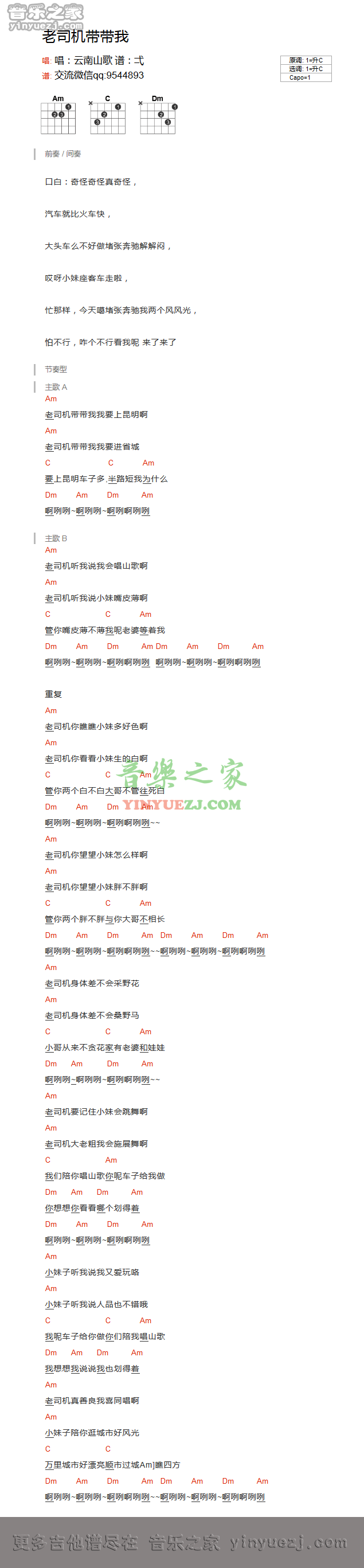 云南山歌《老司机带带我》吉他谱,YYZJ编配出品,共有1张高清图谱,免翻页排版设计。...