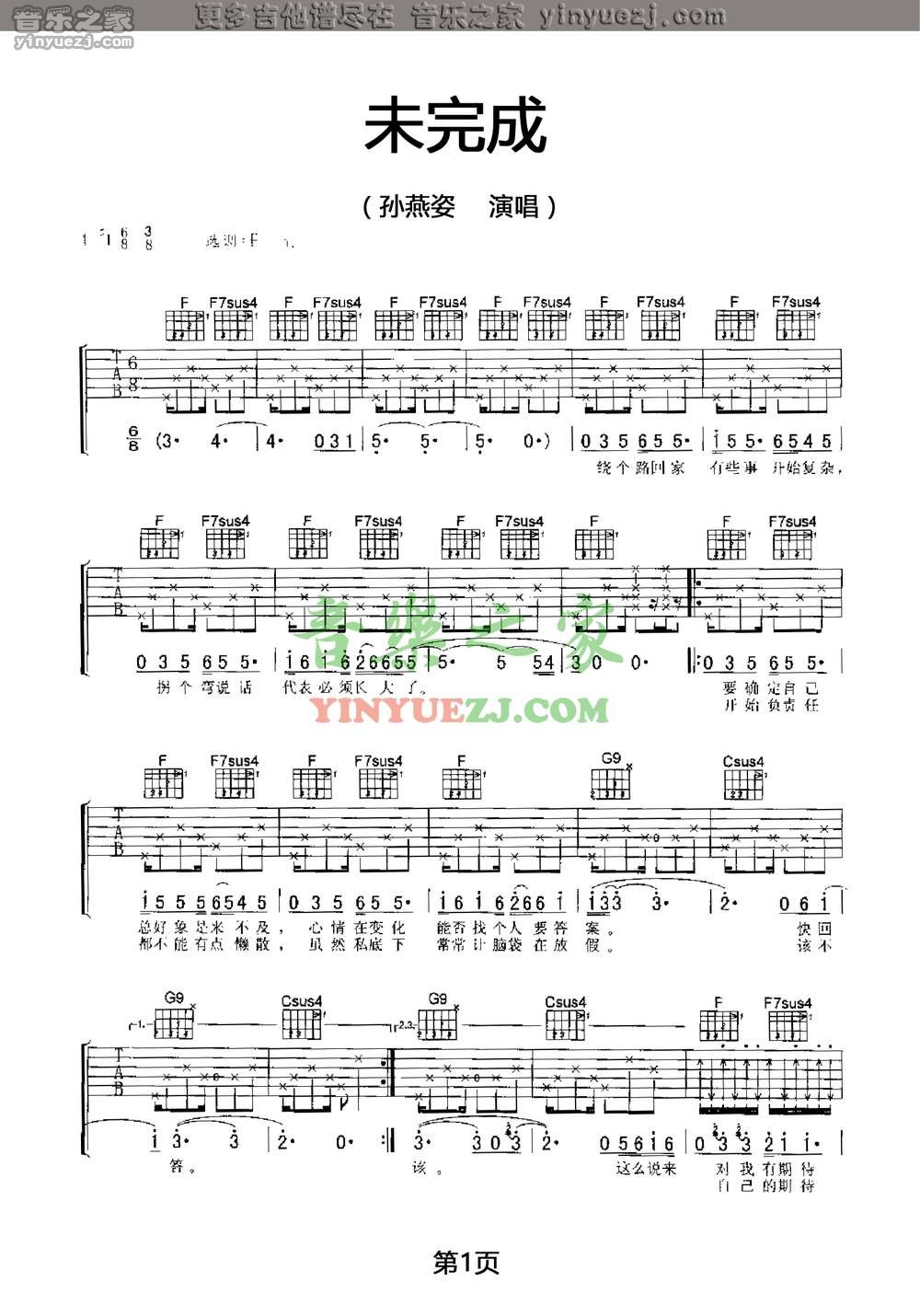 孙燕姿《未完成》吉他谱,YYZJ编配出品,共有3张高清图谱。...