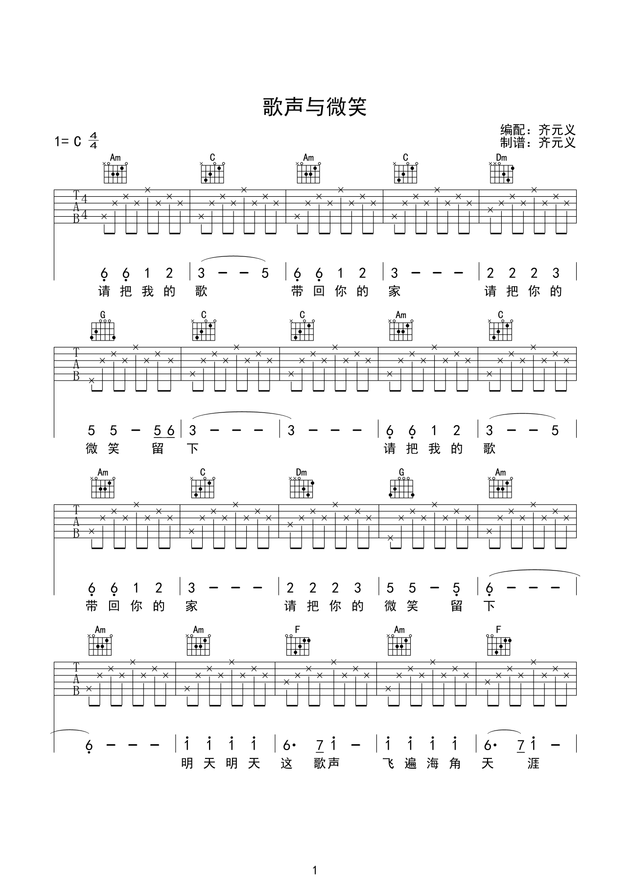 吉他儿歌《歌声与微笑》吉他谱