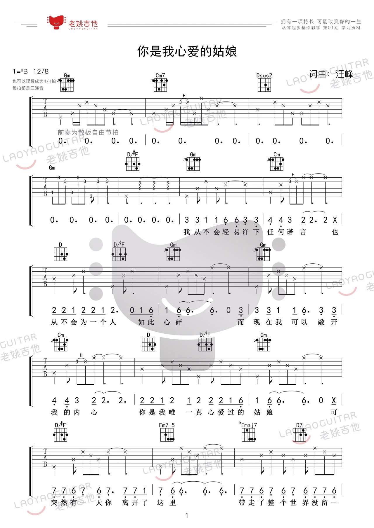 汪峰《你是我心爱的姑娘》吉他谱,老姚吉他编配出品,共有2张高清图谱,免翻页排版设计。...