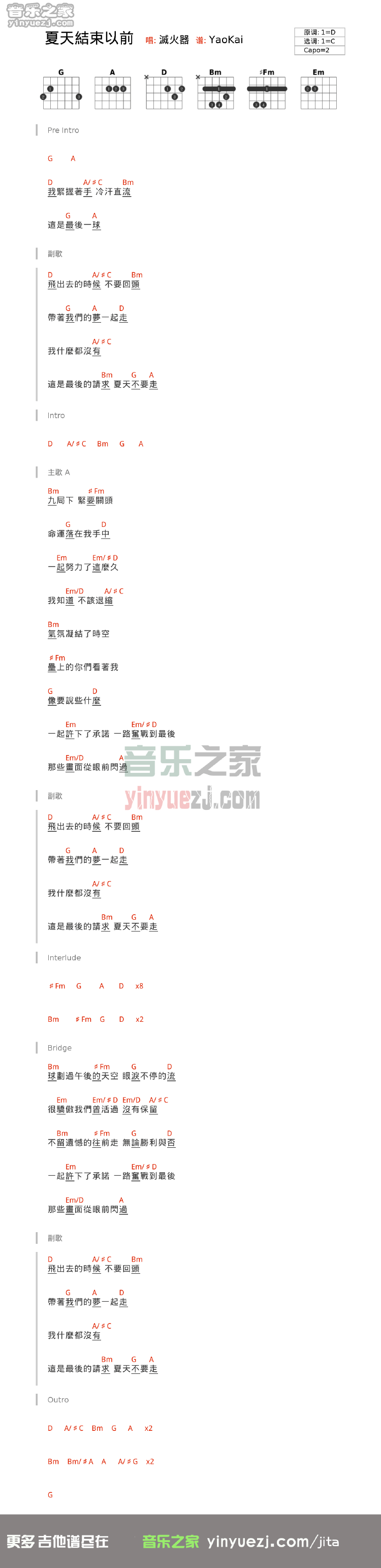 灭火器《夏天结束以前》吉他谱,YYZJ编配出品,共有1张高清图谱,免翻页排版设计。...