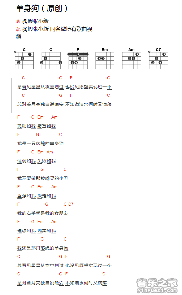 假张小新《单身狗》吉他谱,YYZJ编配出品,共有1张高清图谱,免翻页排版设计。...