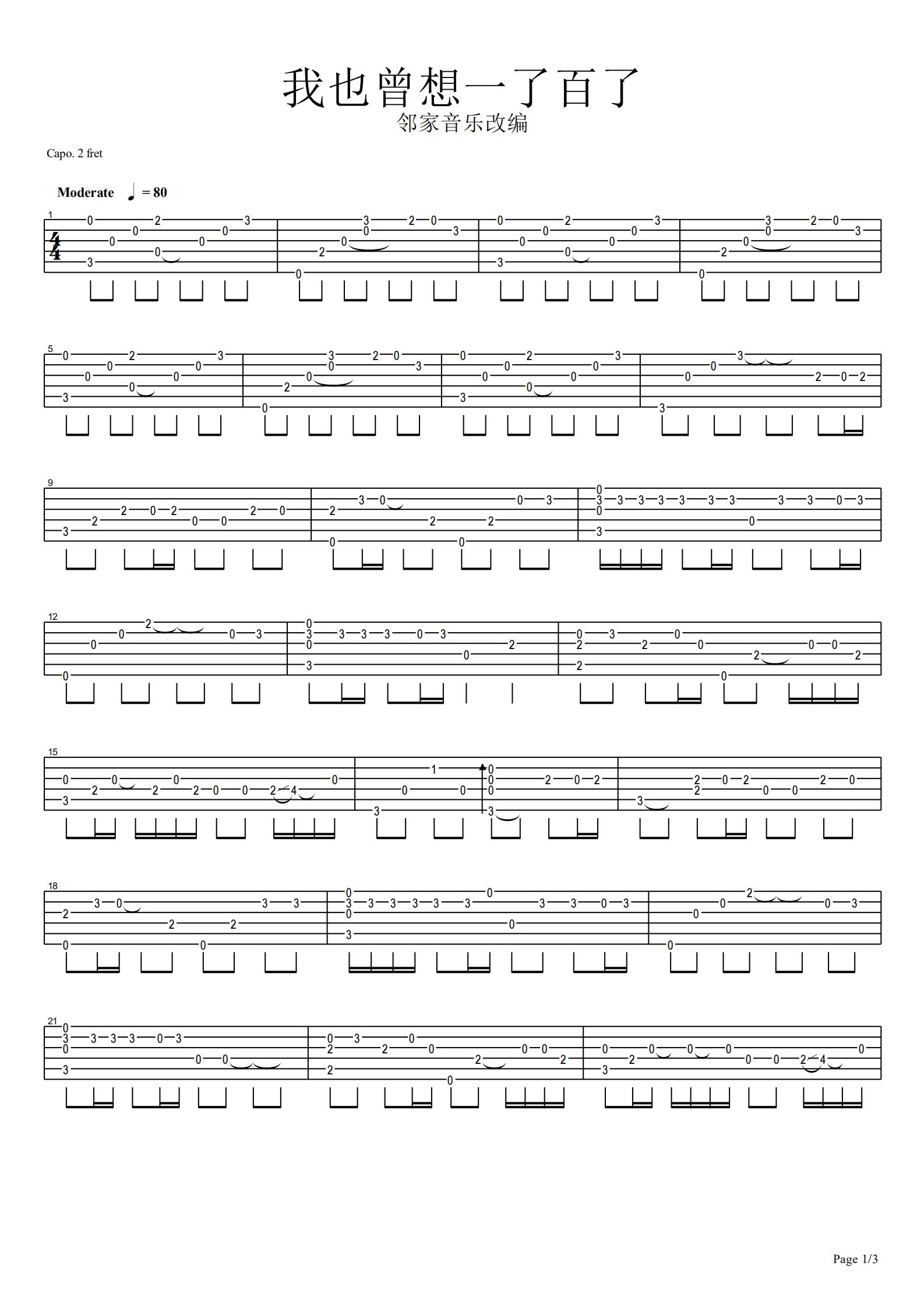 中岛美嘉《曾经我也想过一了百了》吉他谱,邻家音乐编配出品,共有3张高清图谱。...