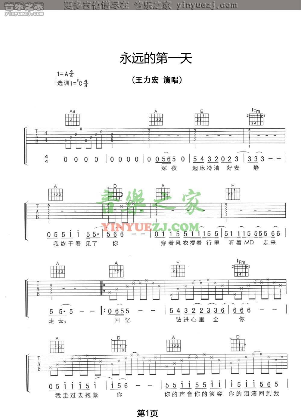 王力宏《永远的第一天》吉他谱,YYZJ编配出品,共有5张高清图谱。...