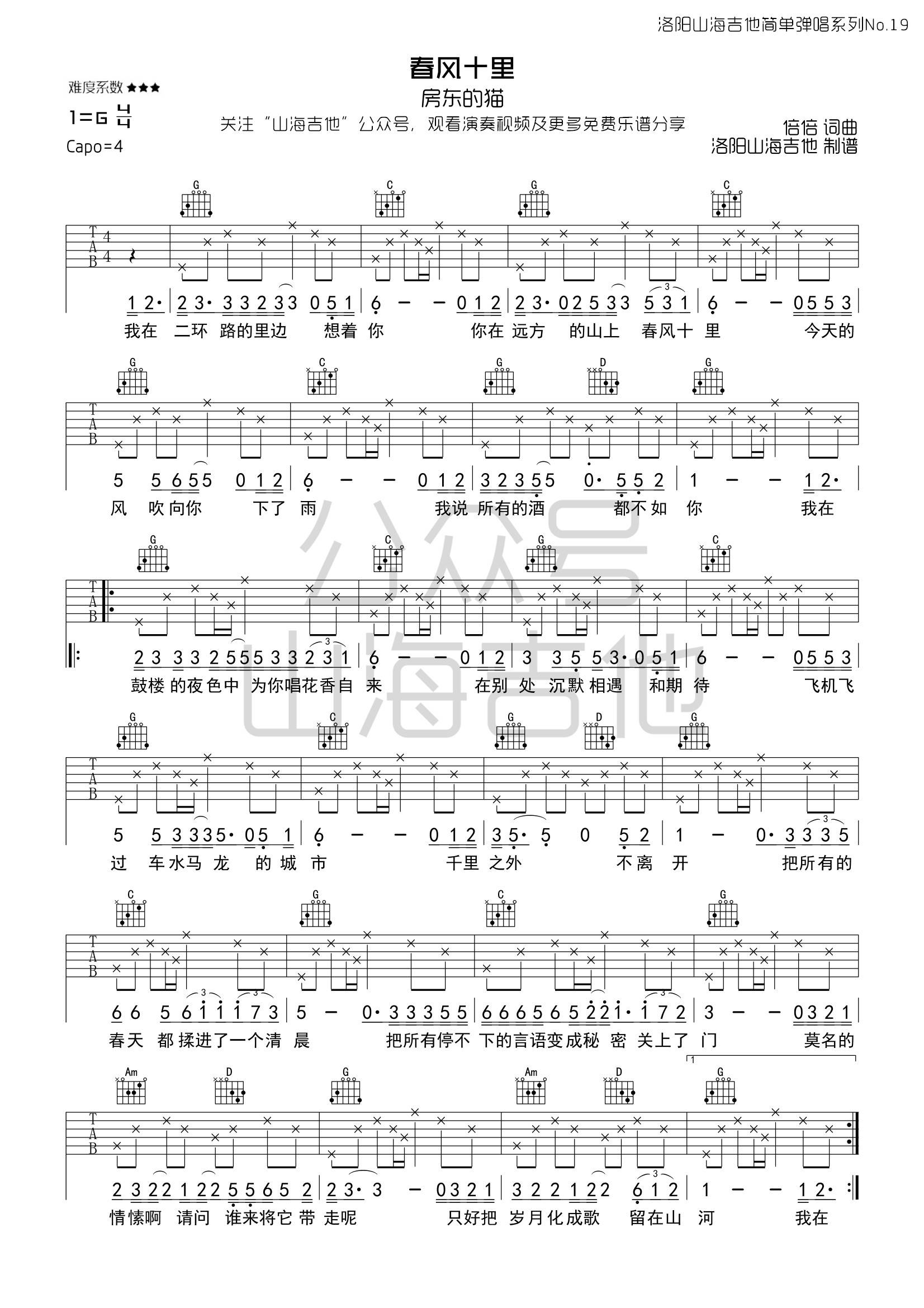 鹿先森乐队《春风十里》吉他谱,洛阳山海吉他编配出品,共有2张高清图谱,免翻页排版设计。...
