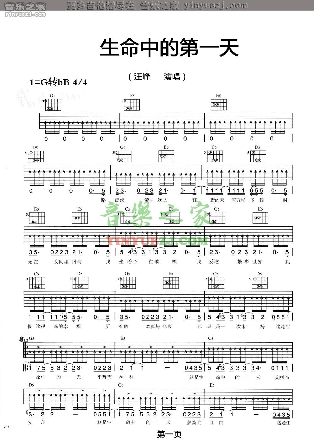 汪峰《生命中的一天》吉他谱,YYZJ编配出品,共有2张高清图谱,免翻页排版设计。...