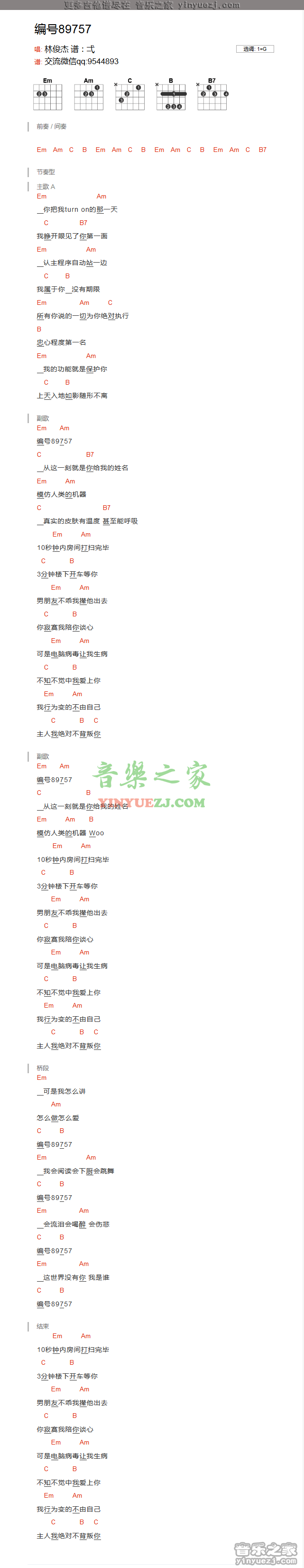 林俊杰《编号89757》吉他谱,YYZJ编配出品,共有1张高清图谱,免翻页排版设计。...