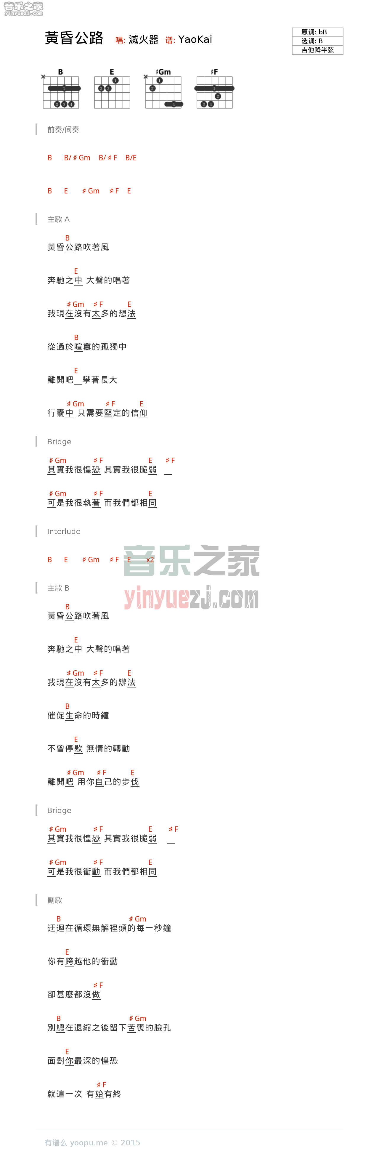 灭火器《黄昏公路》吉他谱,YYZJ编配出品,共有1张高清图谱,免翻页排版设计。...
