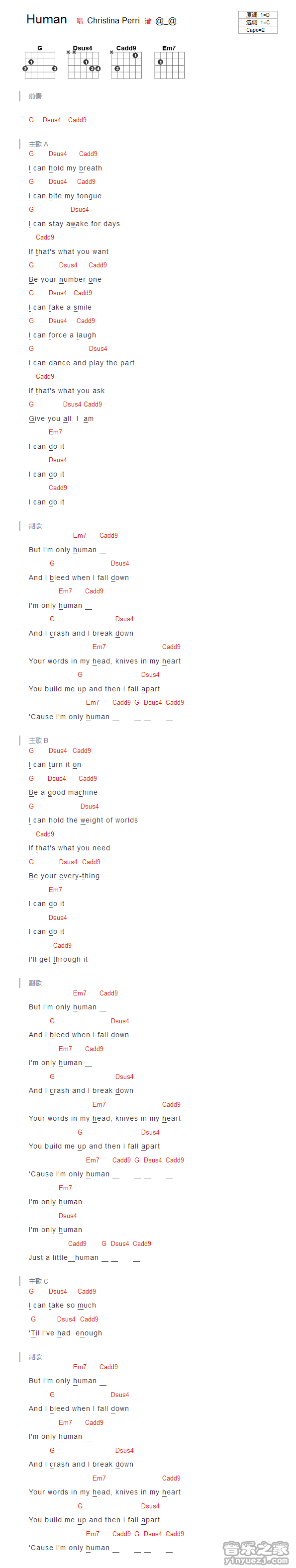 ChristinaPerri《human》吉他谱,YYZJ编配出品,共有1张高清图谱,免翻页排版设计。...