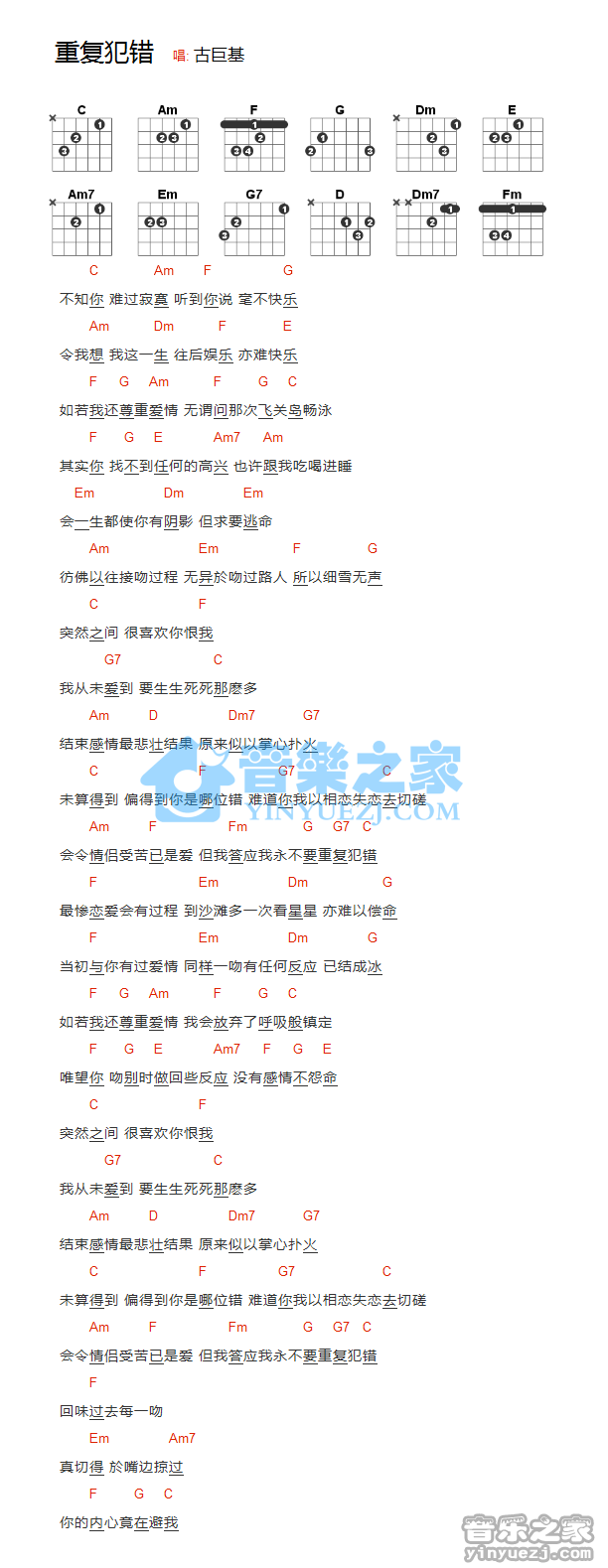 古巨基《重复犯错》吉他谱,YYZJ编配出品,共有1张高清图谱,免翻页排版设计。...